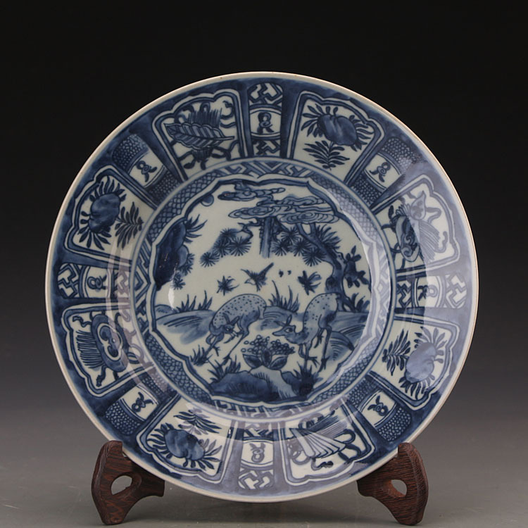 名称:明外销瓷克拉克瓷青花手绘松鹿纹圆盘年代:明代(16-17 世纪)特点:典型的 "中国瓷器为西方生产" 的早期代表,采用青花釉下彩工艺,纹饰繁复饱满,体现了东西方文化交流的特征