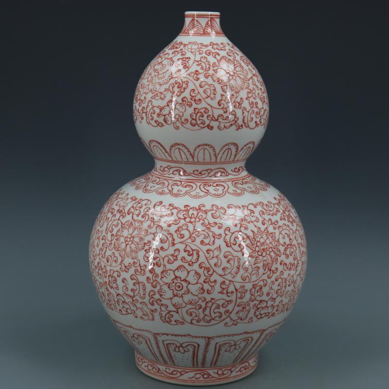 图片说明: 清乾隆釉里红缠枝莲纹葫芦瓶,采用釉里红工艺绘制缠枝莲纹。葫芦造型寓意多子多福,釉里红呈色鲜艳纯正,与洁白的瓷胎形成鲜明对比,体现了乾隆时期制瓷工艺的精湛水平。
