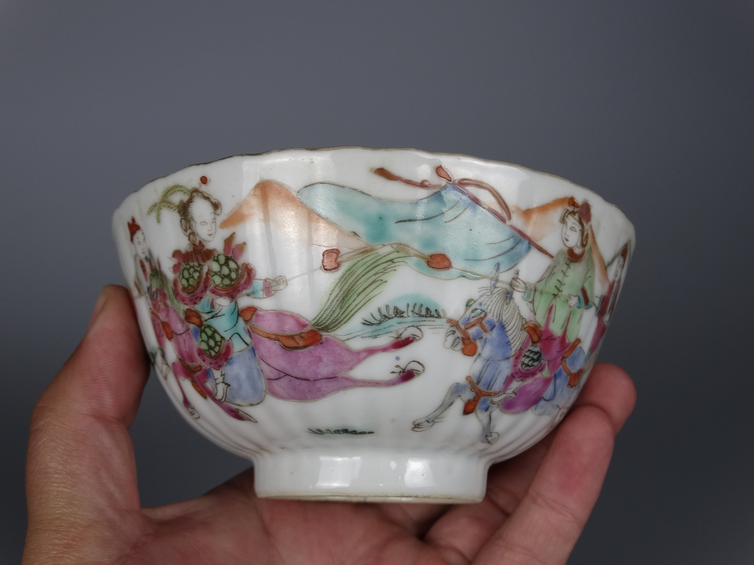 图片说明: 同治粉彩人物故事瓜楞碗,碗形为瓜楞状,造型别致。碗身绘有人物故事图案,色彩丰富,人物形象生动传神。这种将文学故事与瓷器艺术相结合的表现形式,体现了清代粉彩瓷器在题材内容上的丰富性。