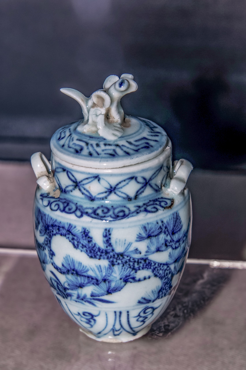 图片说明: 元代青花瓷岁寒三友纹兽钮双系小盖罐,以松、竹、梅 "岁寒三友" 为主题纹样,寓意坚韧不拔的品格。青花发色浓艳深沉,采用勾勒填色的技法,线条流畅有力,体现了元代青花瓷高超的绘画技艺。