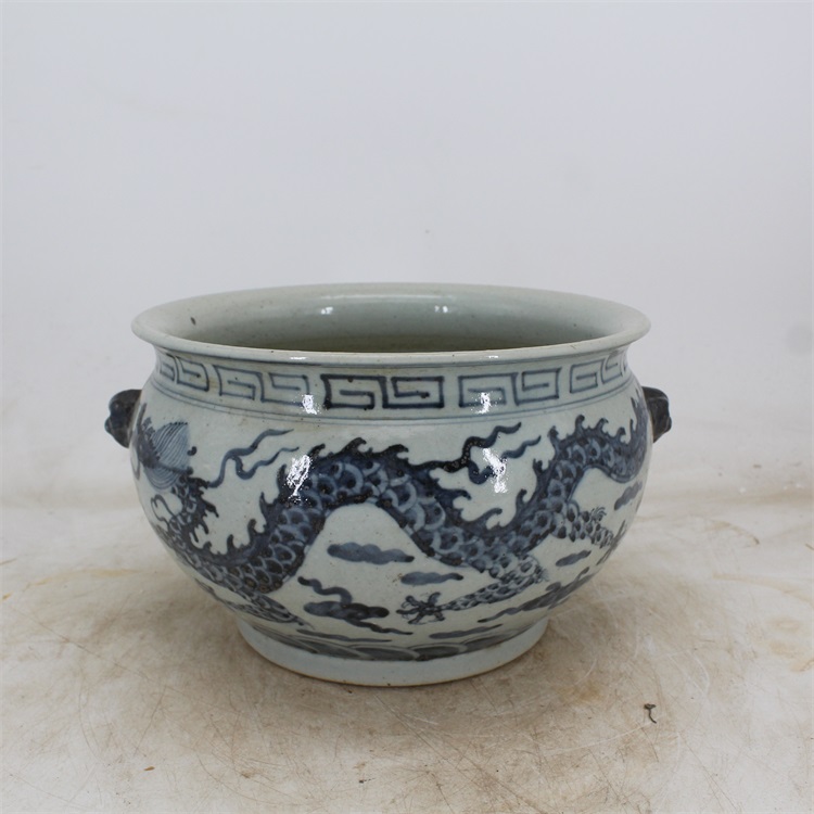 图片说明: 明青花龙凤纹双兽耳香炉,炉身绘有龙凤纹样,龙象征皇权和威严,凤象征吉祥和美好。青花发色深沉稳重,纹样构图对称严谨,体现了明代宫廷用瓷的庄重典雅。