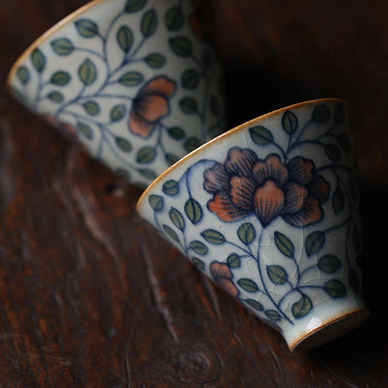 图片说明: 景德镇全手工手绘卷枝牡丹纹斗笠杯,采用传统手工绘制技法。牡丹纹象征富贵吉祥,卷枝形式使纹样更加生动活泼。这种传统工艺的传承体现了景德镇制瓷技艺的延续性。