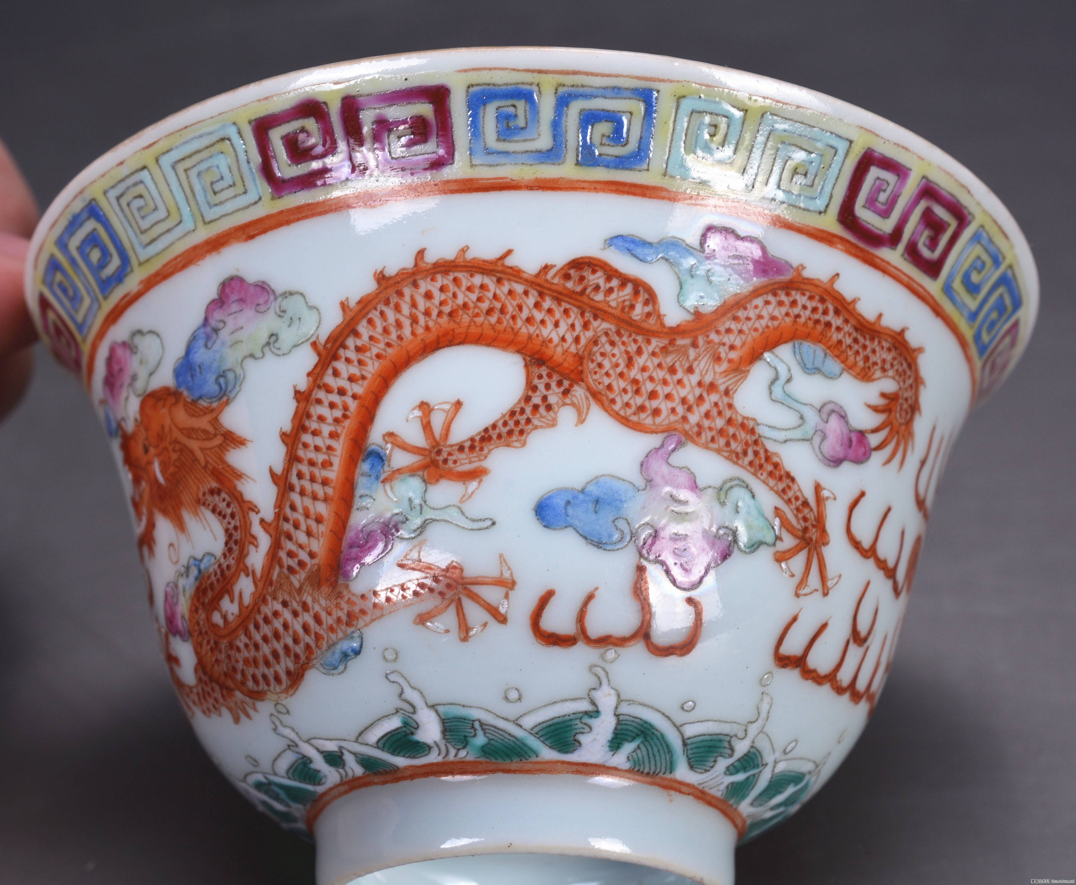 图片说明: 晚清民国粉彩龙纹碗,碗身绘有威武的龙纹图案,龙身采用红、绿、蓝等多种色彩,色彩鲜艳夺目。粉彩技法使图案呈现出柔和的过渡效果,体现了晚清民国时期粉彩瓷器的典型特征。