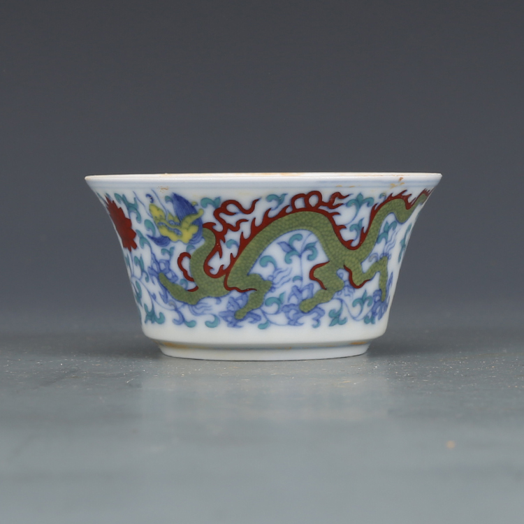 图片说明: 大明成化斗彩龙凤纹杯,采用斗彩工艺绘制龙凤纹样。成化斗彩以其色彩柔和、绘制精细而闻名,龙凤纹样生动传神,体现了明代制瓷工艺的巅峰水平。