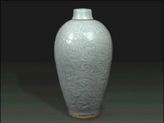 图片说明: 宋代青白瓷刻花缠枝牡丹纹梅瓶,展现了宋代青白瓷的典型特征。瓶身通体施以青白釉,釉色温润如玉,采用刻花技法装饰缠枝牡丹纹样,线条流畅自然,体现了宋代瓷器简约而不失精美的艺术风格。