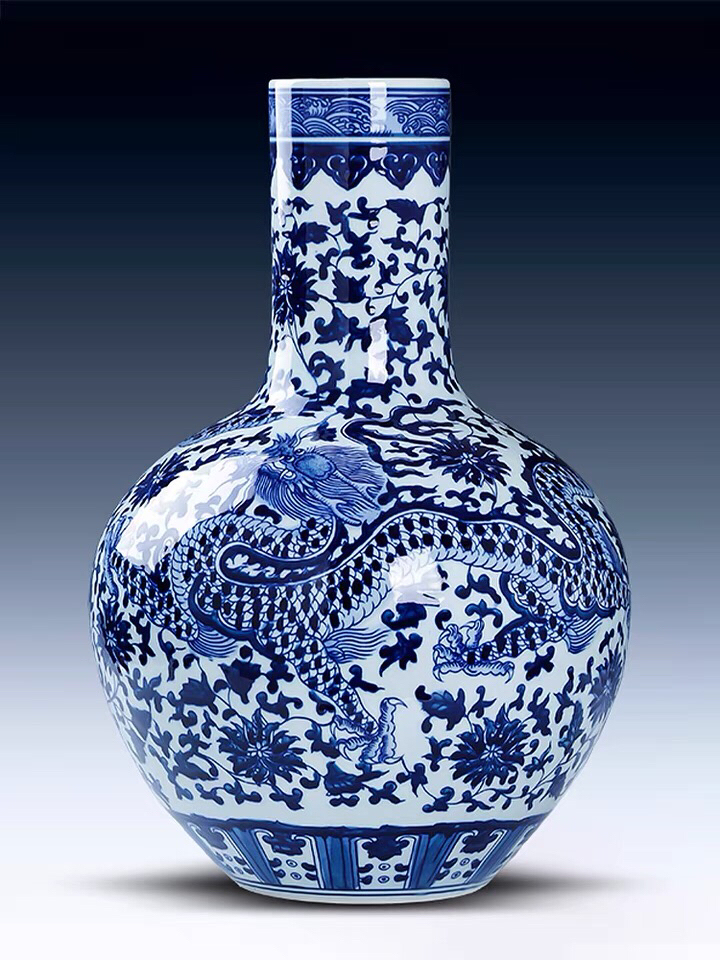 图 1:景德镇青花瓷龙纹天球瓶,乾隆年间烧制,展现了传统青花瓷的精湛工艺和皇家审美