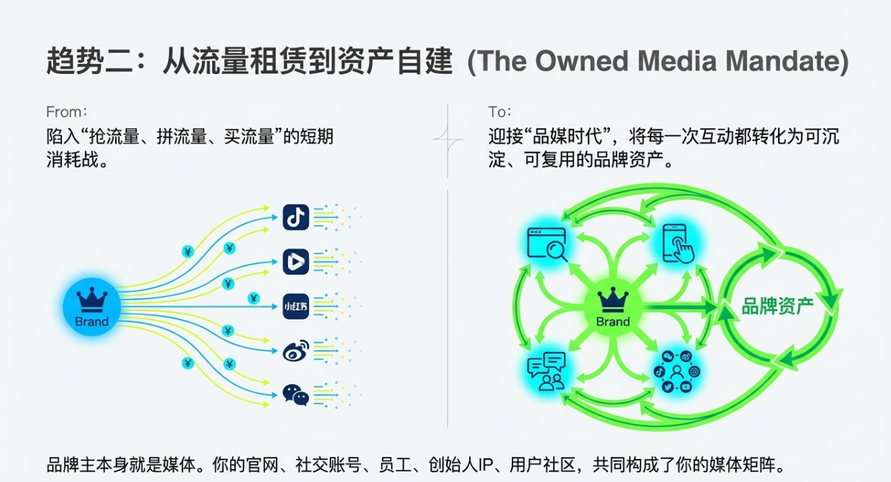 短期投放像租房:你付租金,得到短暂曝光;一停租,归零。2026 的必修课是“品媒时代”:把每一次互动沉淀为可复用资产(页 6)。PPT 讲得很清楚——品牌本身就是媒体,你的官网、社交账号、员工与创始人 IP、用户社区,共同构成你的媒体矩阵;关键是把它们从“散落的珍珠”变成“可运营的资产组合”。