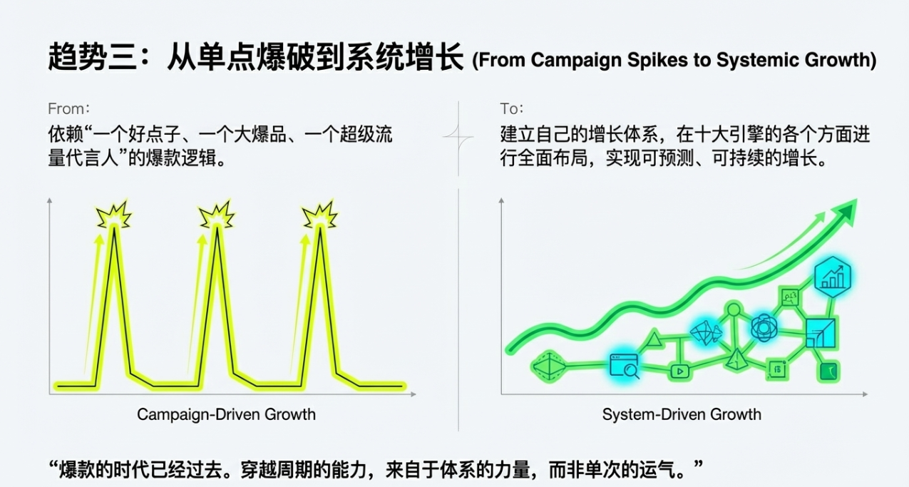 爆点仍然重要,但爆点不再决定生死。决定生死的是:你有没有一套系统把爆点转化为资产、把资产转化为复利(页 7)。换句话说,增长从“上头的运气”迁移到“结构的能力”。