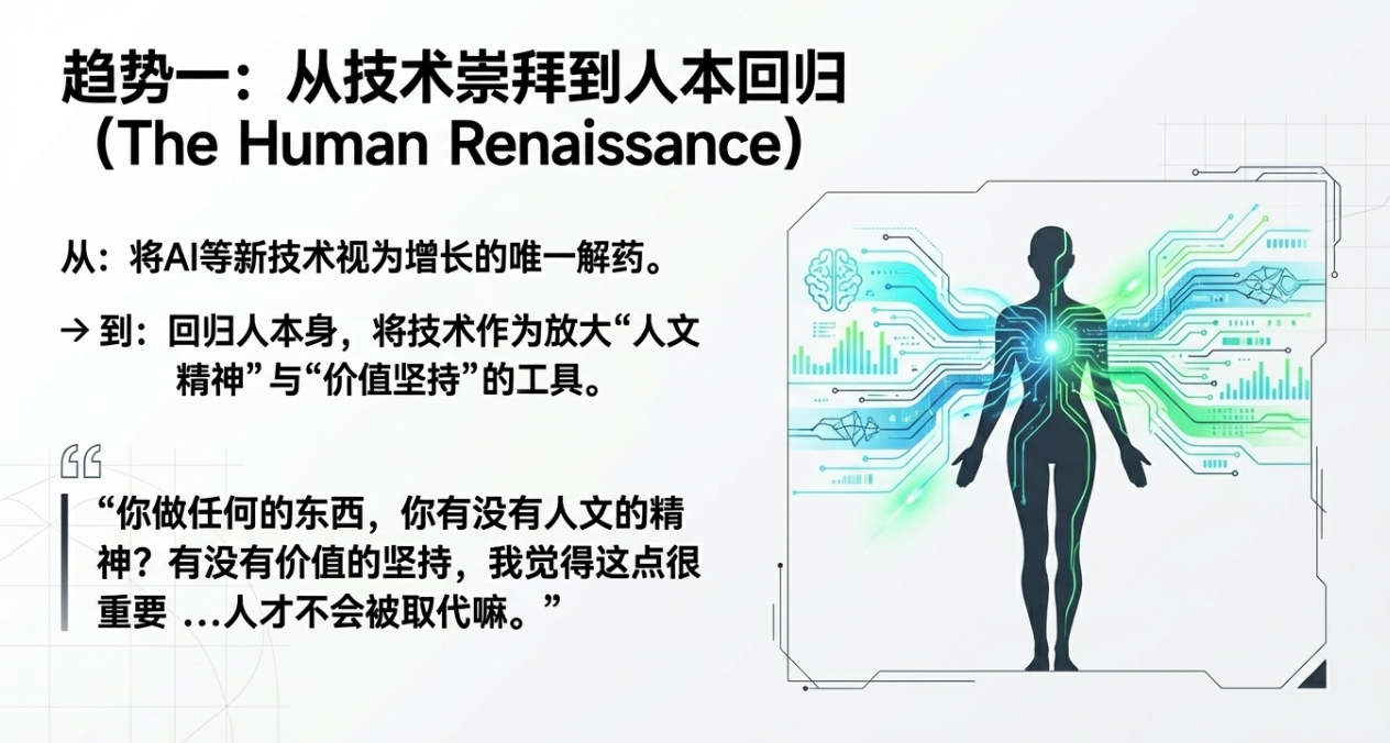 2025 年大量企业把 AI 当“唯一解药”,但 2026 的分水岭在于:AI 的价值不是替代人,而是放大人——放大你的价值坚持、审美判断、服务精神与组织能力(页 5)。当内容生产的边际成本趋近于零,真正稀缺的是“人味”和“可信”。