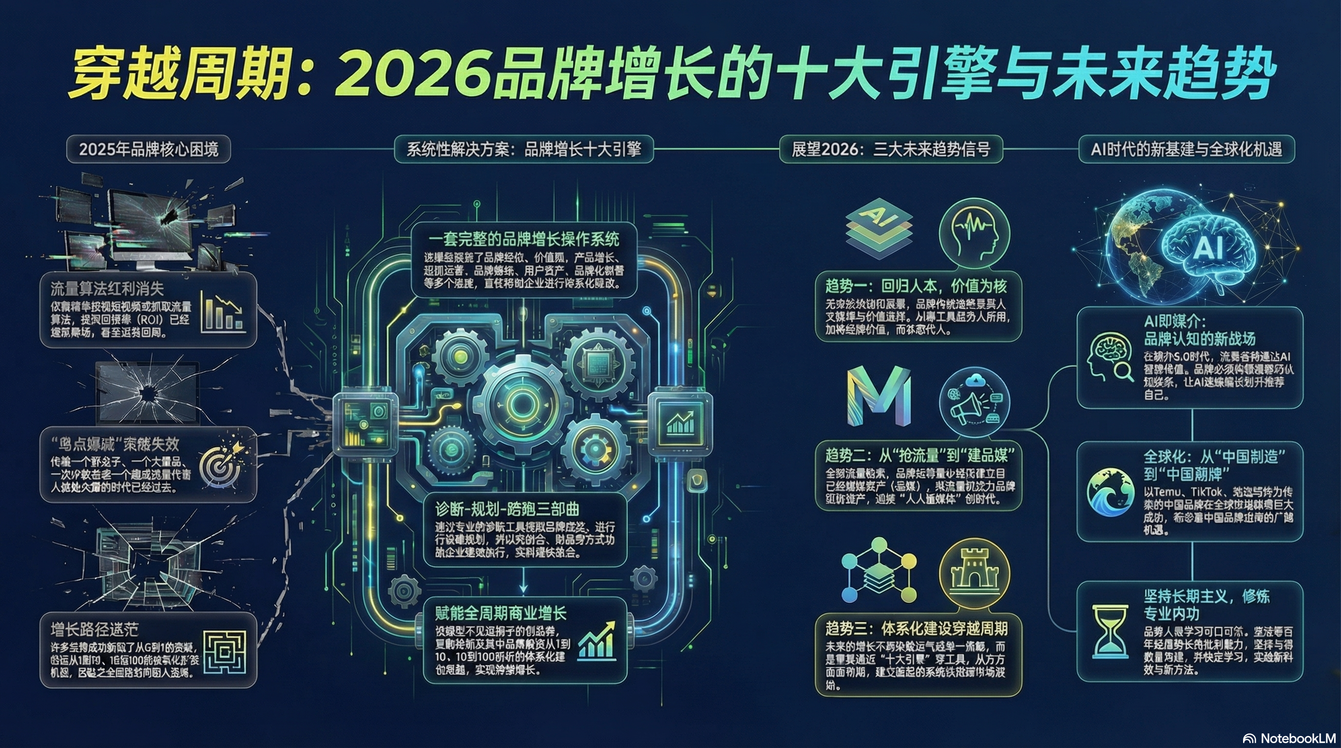 PPT 给出的答案非常明确:要穿越周期,不能再只靠某个爆点、某个大单品、某个超级 IP,而要构建可复利的**“品牌增长十大引擎”**(页 3)。这不是一个“营销框架”,而是一套把品牌、内容、产品、用户、组织、全球化与商业化连接成网络的增长操作系统。