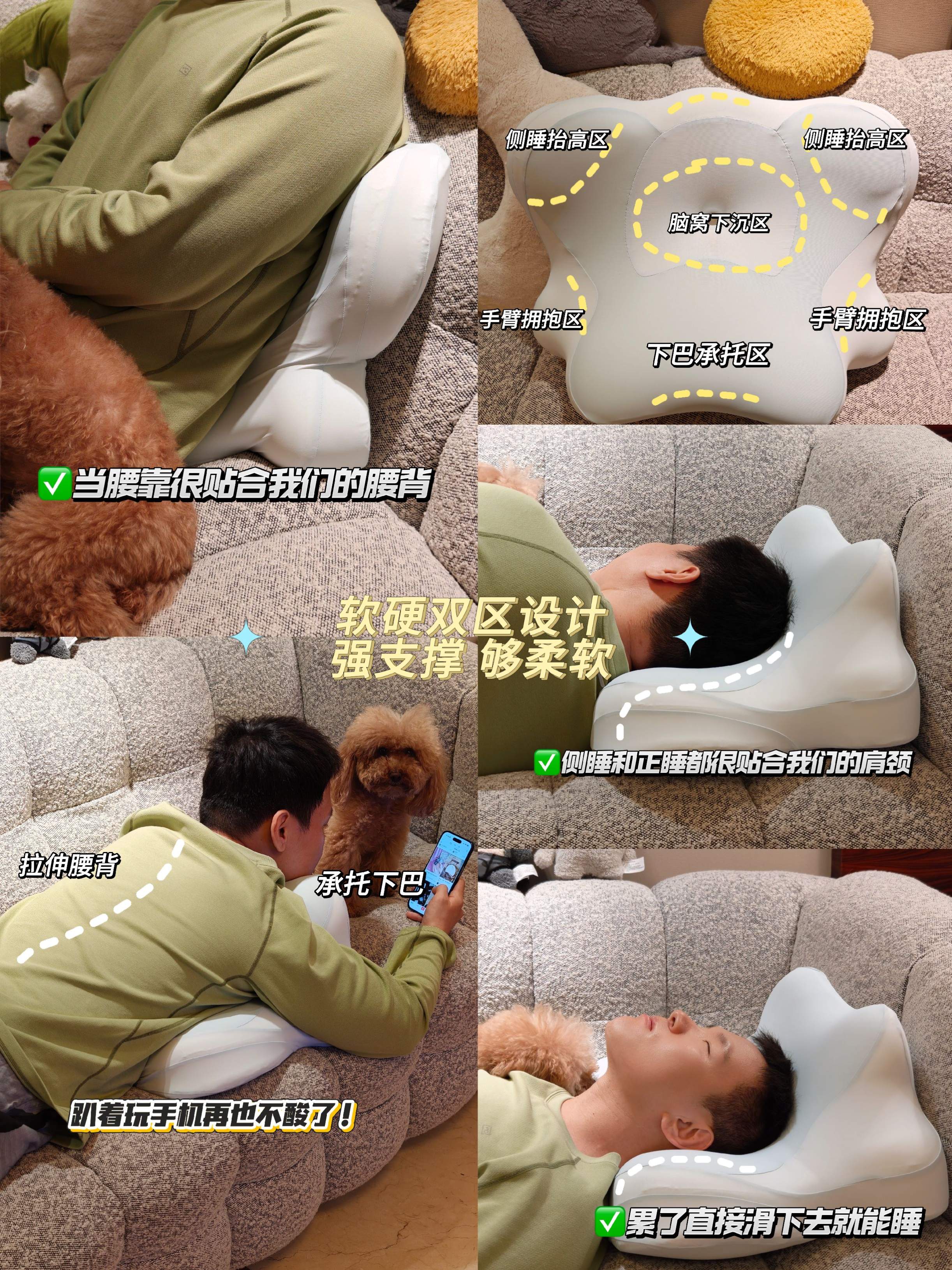 •有了神气小鹿夜猫趴睡护颈枕pro趴着玩时凹槽托下巴,手臂自然环抱,半小时也不酸麻;